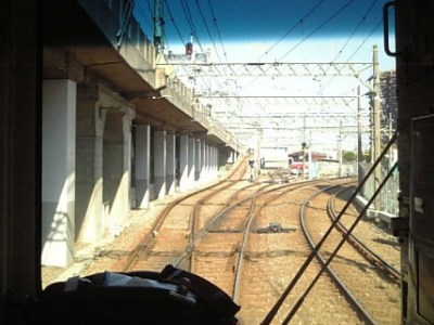 | 京急川崎駅、発車直後 大師線は、右へカーブしていきます。 京急本線の高架線に沿って、まっすぐ伸びている線路は、京急本線への渡り線です。 |
