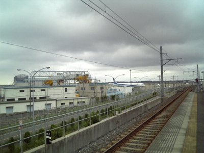 | 芝山千代田駅 ホームより駅前広場方向を望む 小さくて申し訳ないのですが、どこかの飛行機が着陸するところでした。 |