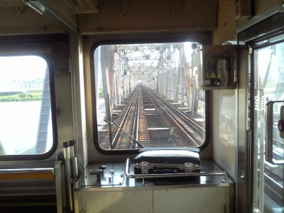 | 押上−曳舟 間 (車内前方より写す) 地上に出て、曳舟駅に進入するところです。 |