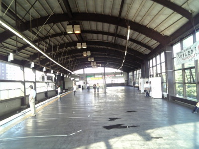 | 大師前駅 ホーム ドーム型の屋根が特徴になっています。 ホームは、片側1線しかありません。2両の電車が、1駅間をいったりきたりするだけなので、これでよいのでしょう。 大師前駅 7:27発で折り返し、西新井駅 7:29着。 |