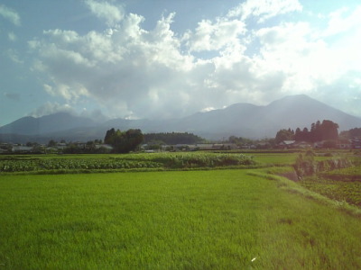 車窓から見た桜島は、残念ながら雲がかかっていました。 |