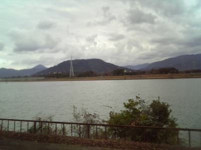 | 鬼塚−唐津 間(車内右窓より写す) 鬼塚駅付近では、松浦川のすぐ横を走ります。 |