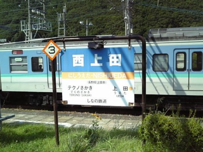 | 西上田駅 14:22発 写真に写っている列車は、上りの小諸行きですが、この車両はJR東日本の115系です。 |