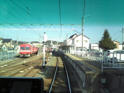 | 八幡駅 (車内前方より写す) 新浜松行きとの行き違いです。 |
