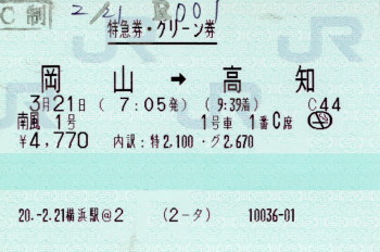 | 2008年3月21日(金)、早朝6時には、岡山駅西口近くのビジネスホテルを出ました。今日は、まず特急「南風1号」で瀬戸大橋を渡り、高知へ向かいます。 |