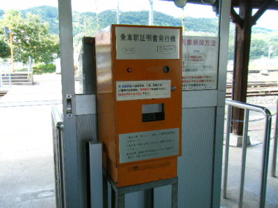 | 郡家駅 は、若桜鉄道 の起点であるにも関わらず、切符はJRしか販売していません。 若桜鉄道 を利用する人は、乗車証明書発行機 で、乗車証明書 を発行し車内で清算します。 |