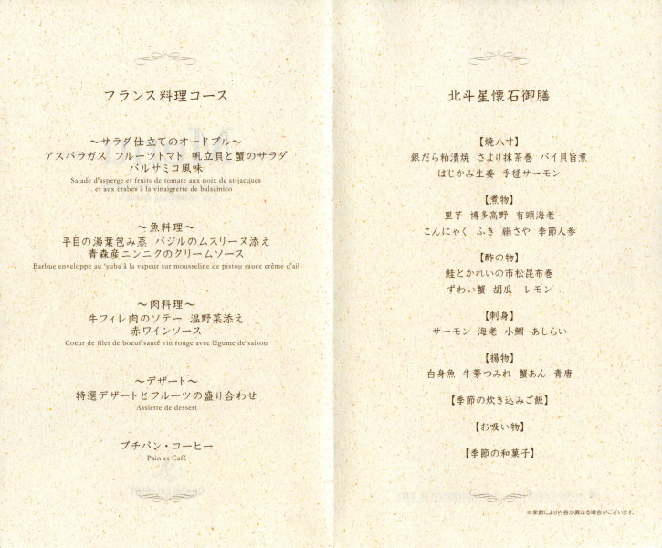 | 19:45から、グランシャリオ(食堂車)で夕食をいただきました。 夕食には、懐石御膳とフランス料理があるのですが、私は懐石御膳の方です。 今夜の予約は私も含めて5組で、私以外は、みなさんフランス料理でした。 |