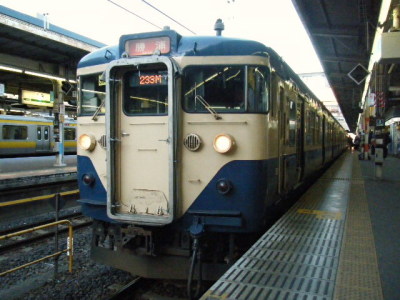 | 東金線 大網駅 成東行き 7:39発 同じ113系でも、今度はなんと湘南色です。 |