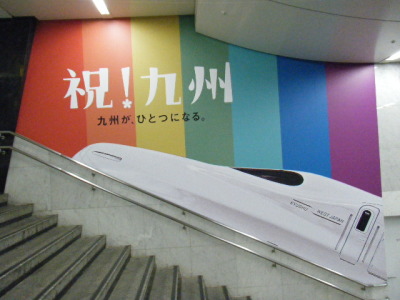 | 階段の側壁に、九州新幹線 が描かれていました。 明後日、いよいよ開業です。 私も、ますます楽しみになってきました。 |