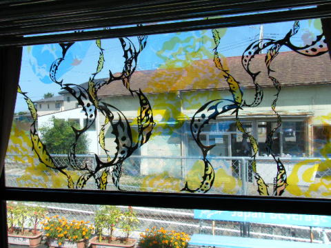 | これも、みなとメディアミュージアム(MMM) の一環でしょうか。 床には 大漁旗 が置かれ、窓ガラスは ステンドグラス になっていました。 |