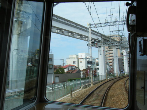 | 蛍池駅 が近づくと、大阪高速鉄道(大阪モノレール線) の軌道が合流してきました。このモノレールにも、いずれは乗らなくてはなりません。 |