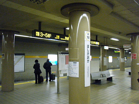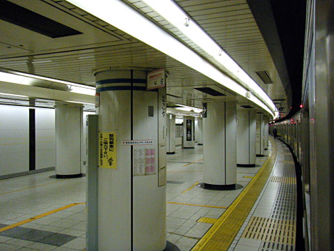 写っているのは 東改札口 ですが、この改札口は 伏見地下街 に直結しており、その営業時間しか乗り降りできないそうです。今もロープが貼られていて利用できないようになっていますが、そのロープにとりつけられている紙には、12月30日から1月3日まで閉鎖する旨、記載されています。 |
