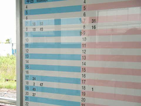 左側が 平日 で、右側が 土曜・休日 です。繰り返しになりますが、平日 は 9本、土曜・休日 はたったの 3本 しかありません。今日は休日なので、次の 18:01発 が 最終列車 です。 |