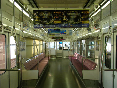 ホームに戻ると、真っ赤な車両が停車していたのでビックリしてしまいました。この車両は先ほど乗車したのと同じ 1000系 ですが、「大阪王将」 のラッピングが施されています。大阪王将 は、餃子 を中心とした中華のお店なんですね。私は大阪の人ではないのでよく知らなかったのですが、あとで調べてみると私の地元の 横浜市内 にも店舗があることが分かり、ちょっと驚きました。 |