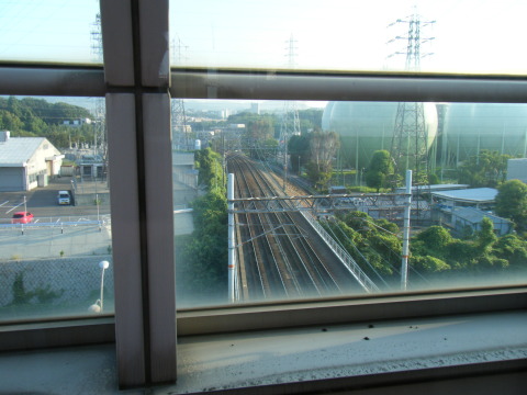 一番前の席に座れたのはよいのですが、正面から思いっきり太陽の光をあび、とても眩しいです。先ほど 千里中央駅 から 大阪空港行き に乗車したときは 西 へ向かいましたが、今度はその逆に 東 へ向かっているわけですから仕方がありません。 |