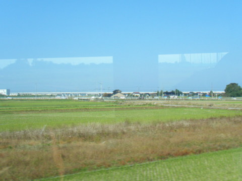 進行方向右側、遠くの方に、建設中の 北陸新幹線 の 高架線 が見えてきました。北陸新幹線 が開業するのは、2015年春 の予定です。あと1年ちょっとで、北陸 にも 新幹線 で来れる時代になるんですねえ。 |