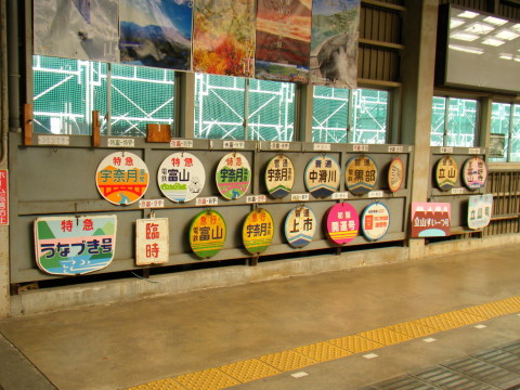 | 電鉄富山駅 ホームに飾られた各種ヘッドマーク |