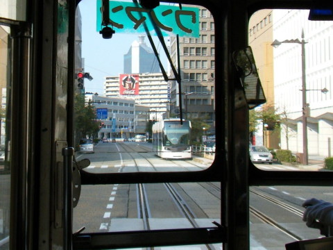 前方から、T100形 がやってきました。この T100形 は、富山市内軌道線 の中では一番新しい車両で、サントラム(SANTRAM) とも呼ばれています。いわゆる LRT(ライトレールトランジット) の車両で、こちらとはずいぶん違います。 |