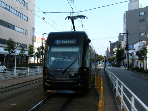 今度は、先ほど 2系統 で乗車した 7000形 ((9)を参照) とはずいぶん違う車両がやってきました。この車両は 9000形 で、セントラム(CENTRAM) とも呼ばれています。2系統 に乗車しているときにすれ違った T100形 ((9)を参照) もそうですが、いわゆる LRT(ライトレールトランジット) の車両です。7000形 にもまだまだがんばってほしいものですが、今後はこういった車両が増えていくのでしょう。 |